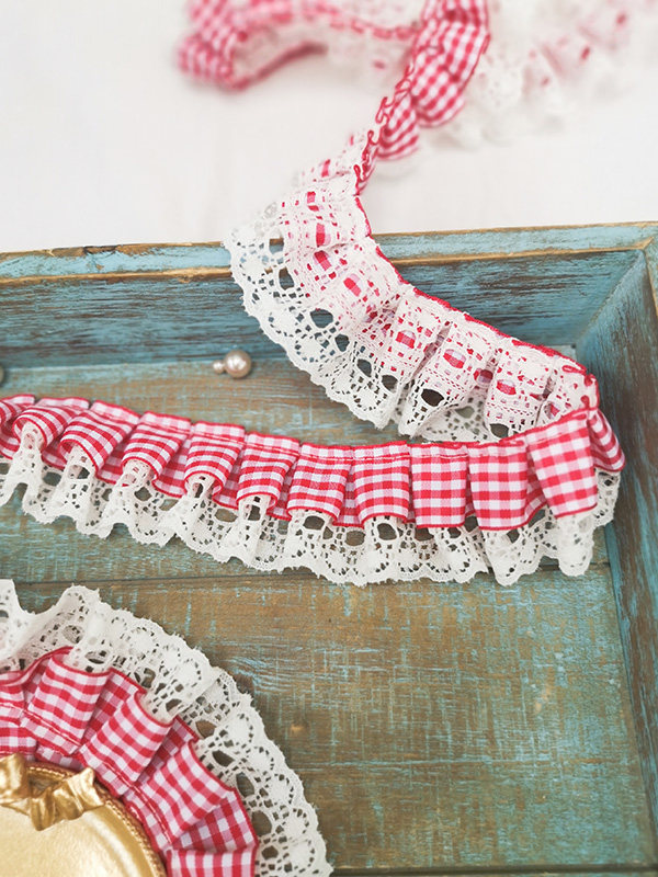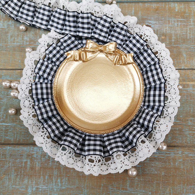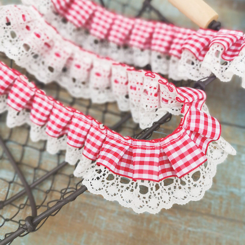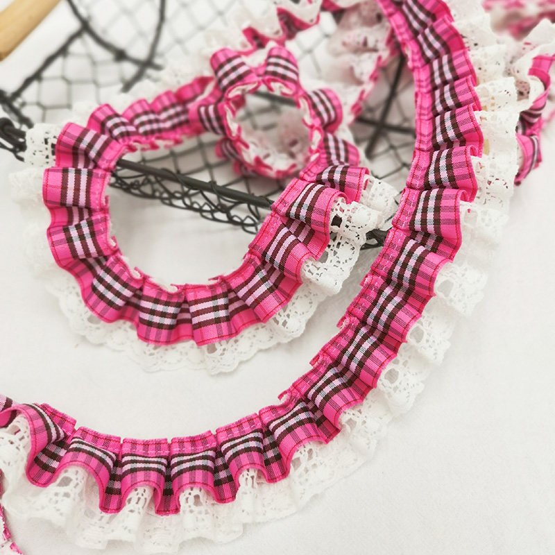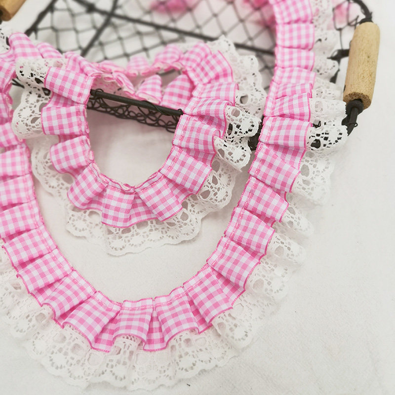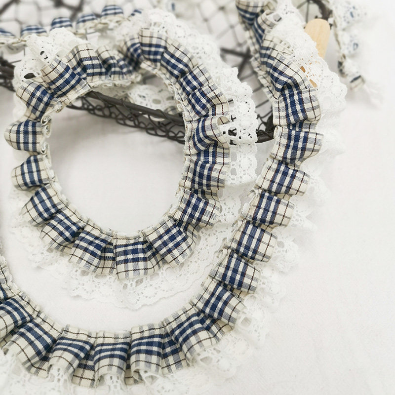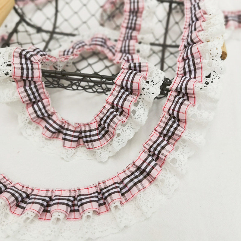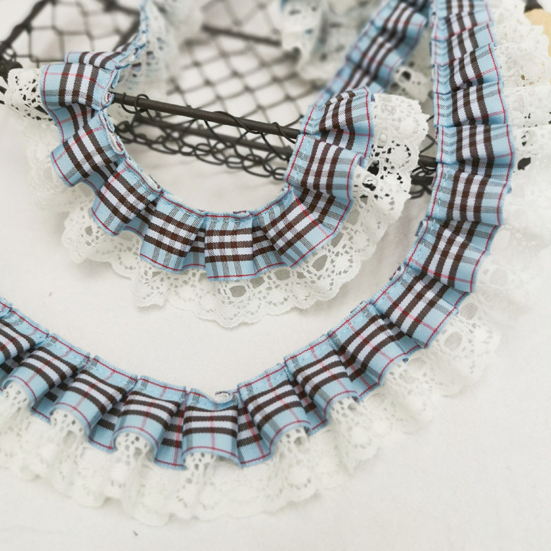 自加工 底层蕾丝上面一层格子带,褶皱整齐密实,无弹力,好质量。