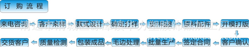 | 定制流程 | 客户提供稿件/构思→谈好价格,确定订单→付好打样费→我司安排打样→寄样客户确认样板→客户确认好样板→双方签订订购合同→客户付30%定金→我司安排生产大货→大货完成拍照大货产品或者客户亲自验货→付清70%定金→我司发货→售后服务→完成交易→模具保存,期待下次合作。 | |