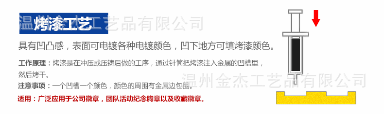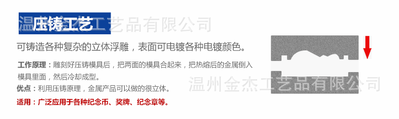 ▲ 主营产品介绍:本厂专业生产纪念币(金币、银币、铜币、各种镀金、镀银纪念币)、纪念章、纪念盘、徽章(景泰蓝、珐琅、仿珐琅、烤漆滴胶、贴纸滴胶、不干胶等各种金属工艺徽章);校徽、胸章、胸针、开瓶器.钥匙扣、代币扣、领带夹、书签、奖章、奖牌、运动章、标牌、铭牌、证章、袖扣、金属商标、工艺礼品等各种金属工艺品