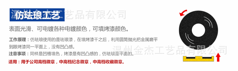 冲压、液压、压铸、腐蚀、抛光、电镀、珐琅、仿珐琅、烤漆、滴胶、印刷等。设备一应俱全。产品中间可以按客户要求制作各种激光logo,丝印logo,CD纹logo,胶片logo.产品适用于做活动促销礼品赠送,派送,广告和促销品,节日赠品。