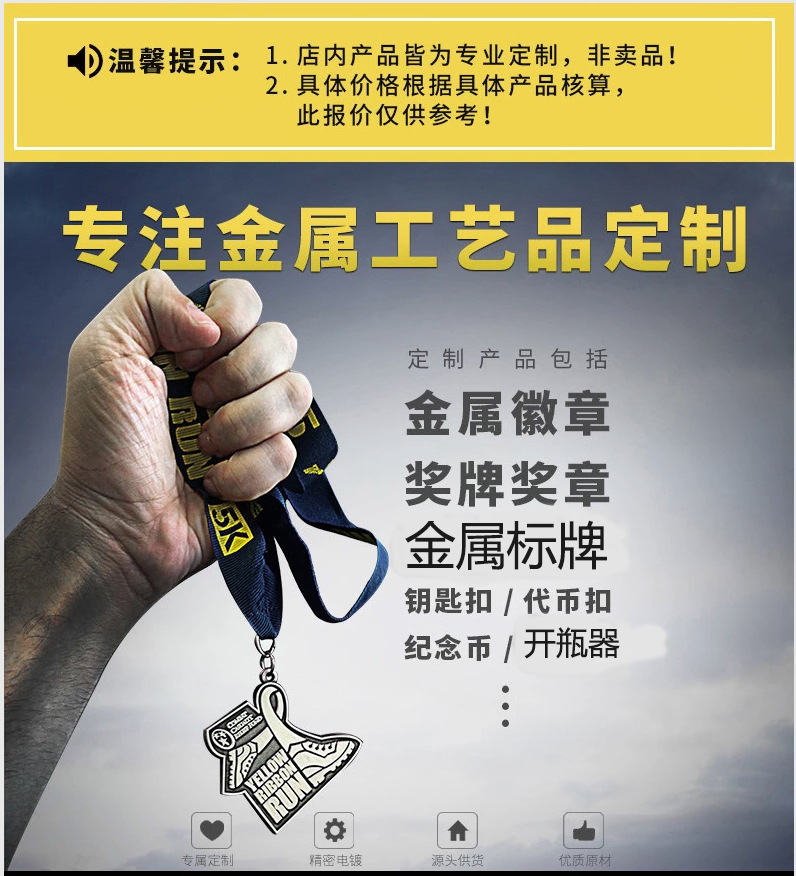 本司专业生产五金钥匙扣,徽章,标牌,广告促销礼品,各种摆挂件.凭着多年的生产和经营,我司已经达到一定的规模,质优价廉,信誉第一。客户的满意是我们的首要关注的问题。我们会不断努力,以维持我们的服务质量以及市场竞争能力,实现全面客户满意。一个专业的服务团队,每一个客户的订单从生产到您的仓库,我们要安排好一切,使您更容易。公司秉承"顾客至上,锐意进取"的经营理念,坚持"客户第一"的原则为广大客户提供优质的服务。欢迎惠顾!