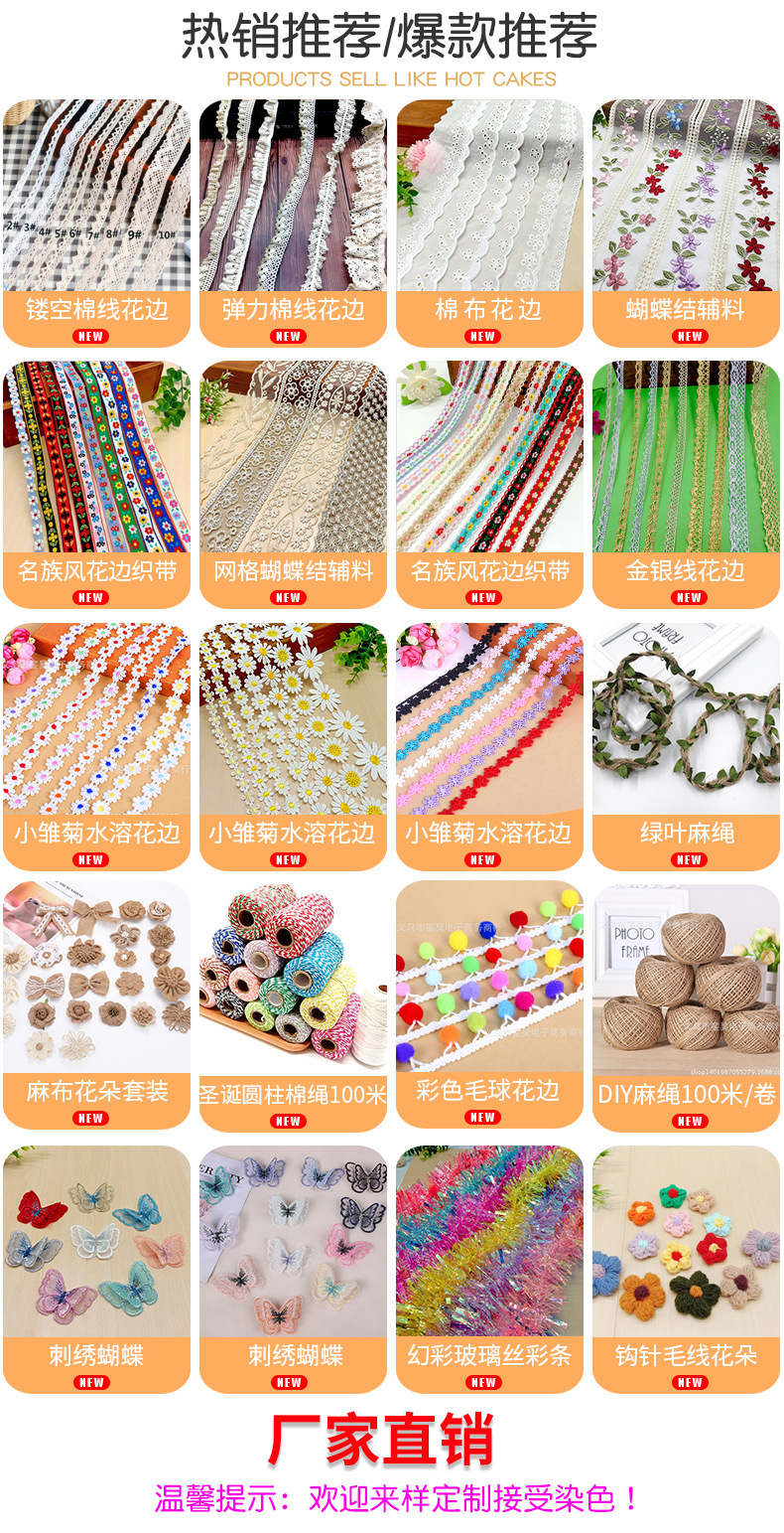 用途;少数民族花边服装辅料,家纺辅料,舞台用品辅料,窗帘辅料,玩具辅料,鞋子辅料,DIY各种手工艺辅料等等