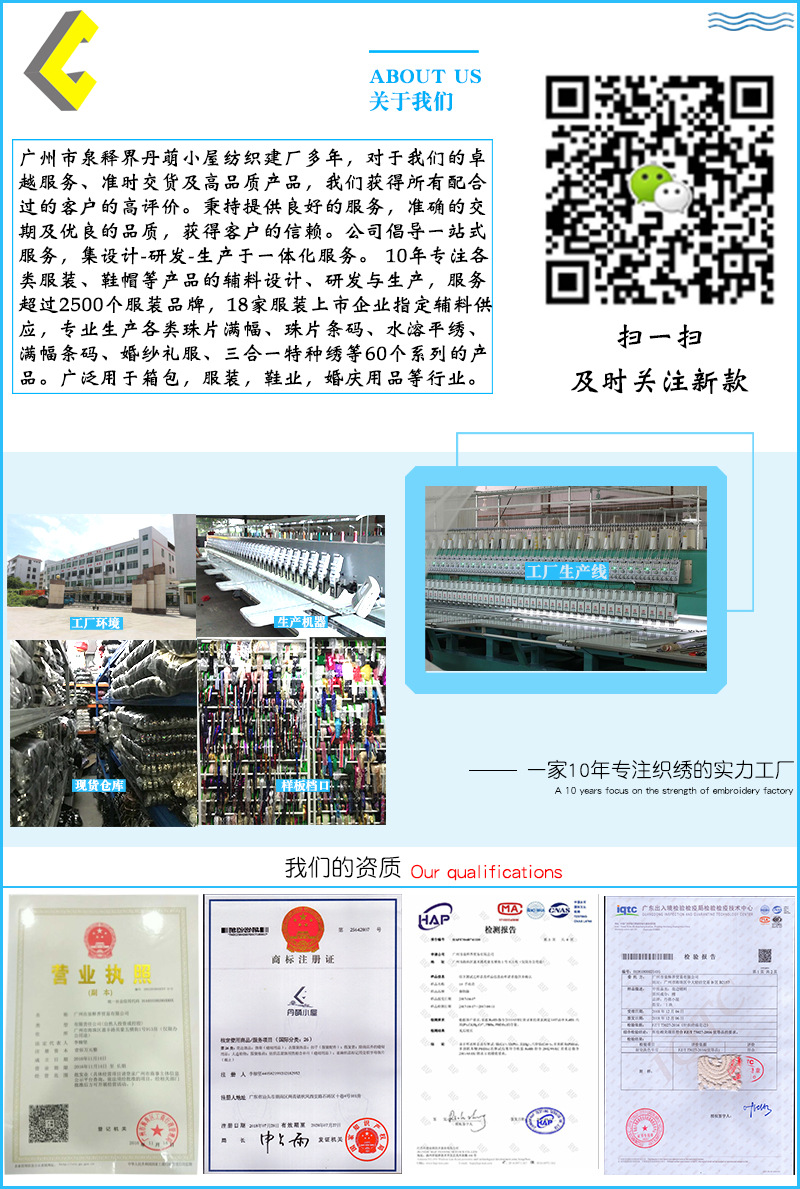本公司长期大量供应同款或其他欧美时尚风格款式的绣花布,法国蕾丝布,水溶花边布,提花网纱布,提花刺绣棉布,欧根纱绣花布,等,如有需要,请随时与我们联系。