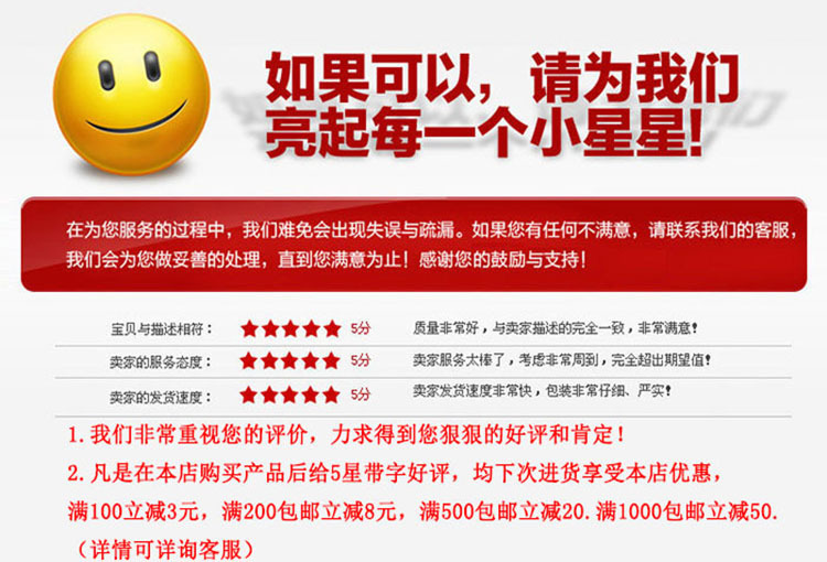 3.退回的商品必须包装完好,以免发回快递途中损坏(如损坏我们拒收)。注:我们公司不收到付件,如有到付只得拒收。