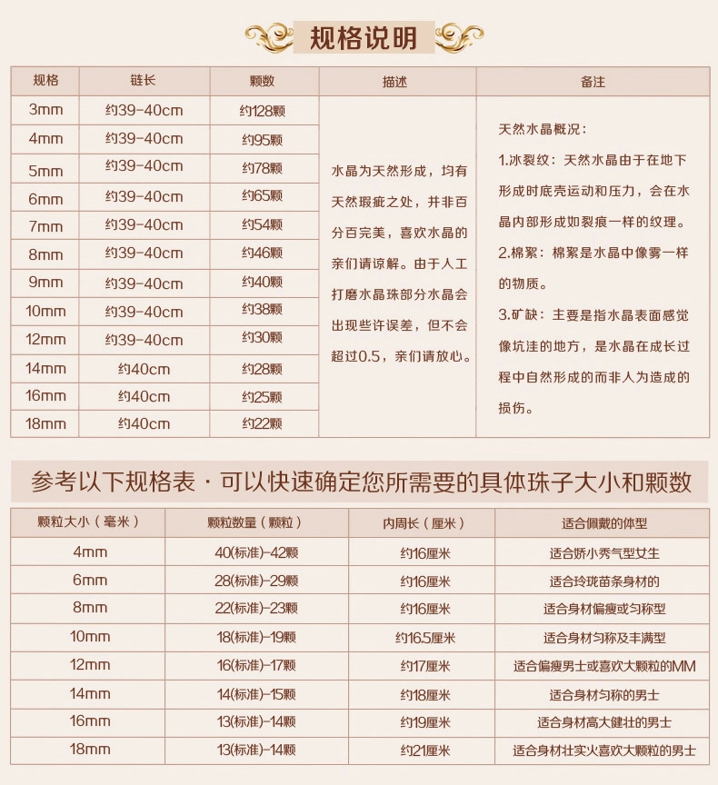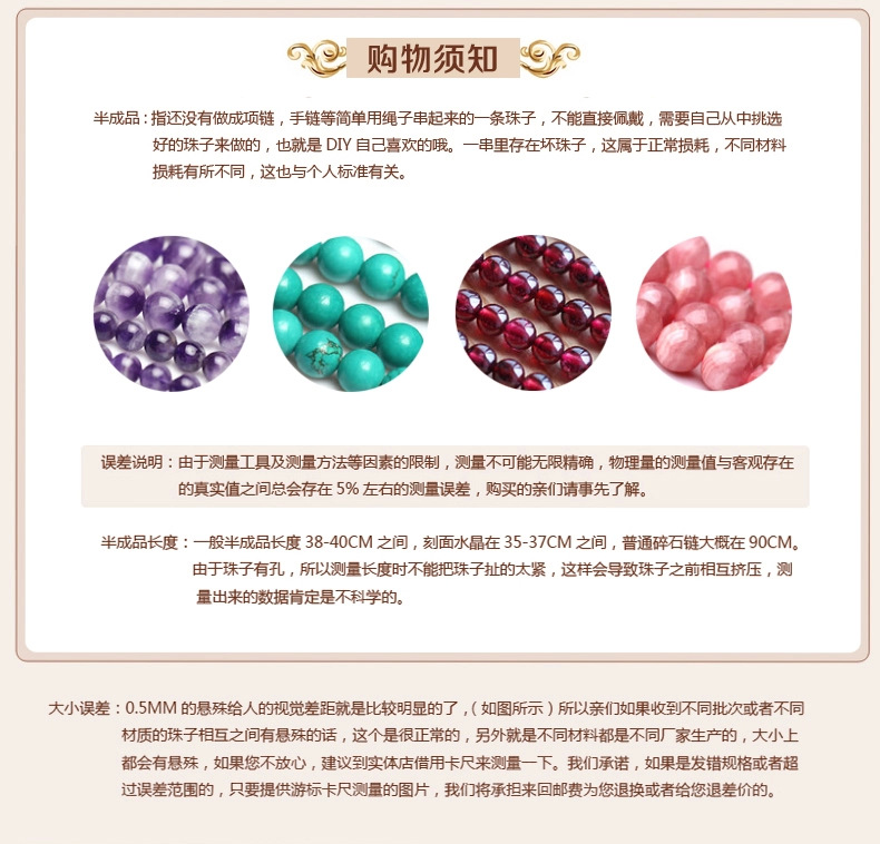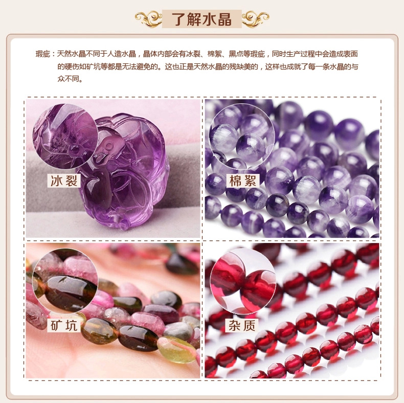 部分天然水晶晶体内都具有天然棉絮,冰裂,矿缺,和打磨过程中人为造成的硬伤,还有的手链单珠会有微小的大小悬殊.这就是我们所说的缺憾美。就象喜欢一个人一样,喜欢他(她)就要接受他(她)的缺点,人无完人,更何况是出自亿万年前的宝石呢。请大家了解天然水晶、爱护天然水晶,希望每一个属于您的水晶都能给您带来好运。