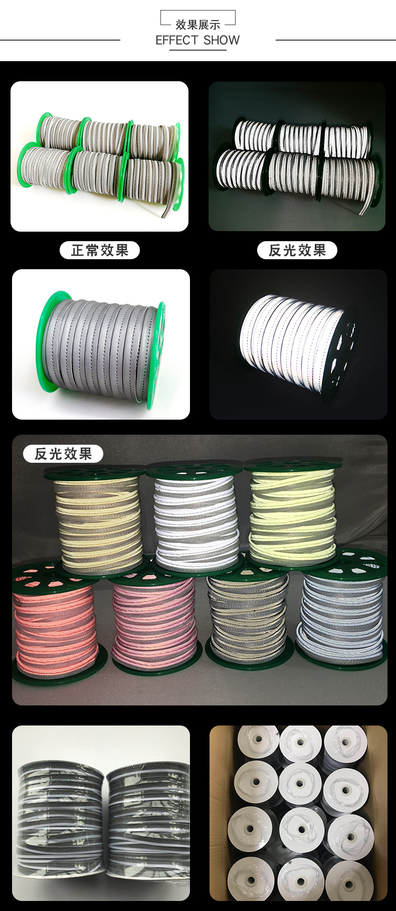 公司常规备库的反光包边规格为1.3cm反光布缝1.7cm的长丝布,棉绳规格3*6。 我们可根据客户要求定制不同
