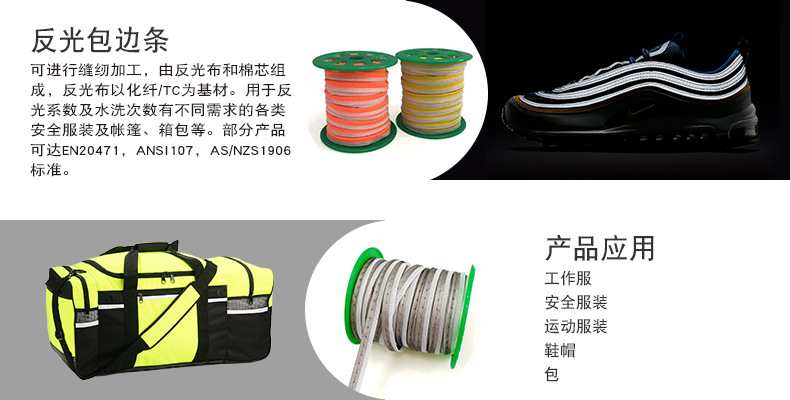 公司常规备库的反光包边规格为1.3cm反光布缝1.7cm的长丝布,棉绳规格3*6。 我们可根据客户要求定制不同