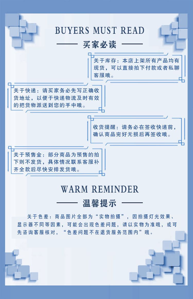 部分商品及偏远地区(例如:新疆、西藏、香港、澳门、台湾等地区)无法包邮,详情请询问客服修改运费,部分商品为预售款页面价格为预付定金,下单前请与客服联系确认,部分商品款式或与页面图片有些许不同,请您下单前与客服确定规格款式,以免造成误会,给您带来的不便敬请谅解!