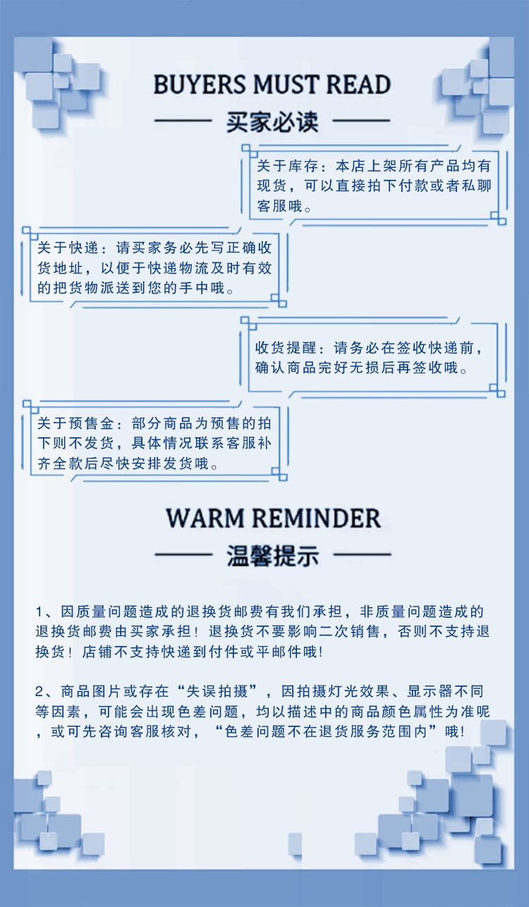 部分商品及偏远地区(例如: 新疆、西藏、香港、澳门、台湾等地区)无法包邮,详情请询 问客服修改运费,部分商品为预售款页面价格为预付定金,下 单前请与客服联系确认,部分商品款式或与页面图片有些许不 同,请您下单前与客服确定规格款式,以免给造成误会,给您 带来的不便敬请谅解!