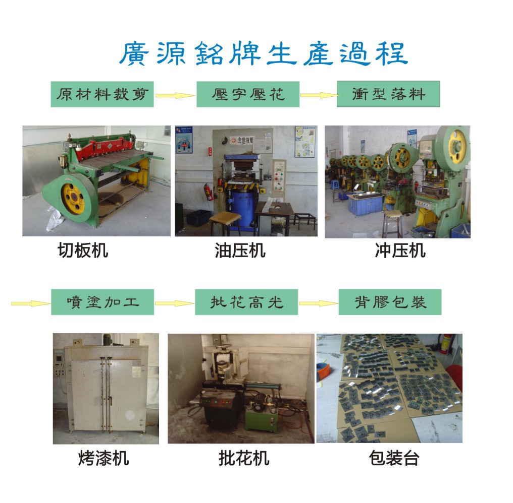 深圳市广源五金科技有限公司是一家专业金属铭牌,铝标牌,铝铭牌,电铸铭牌,滴胶铭牌,标牌铭牌,金属logo,金属贴标,公司铭牌等的企业。位于深圳市宝安区松岗山门第三工业区鑫永盛科技园。工厂按照IS9001标准生产,对原材料采购、图纸设计、模具制造、产前巡检、成品检验、包装、入库实施全过程质量控制。广源本着“诚信,团结,创新,精益求精”的经营理念,不断提升技术、品质与售后服务,承诺以优质的产品和一流的服务来回报您的支持和信任。您的要求就是我们不断的追求,我们愿个所有的客户创造美好未来。。。。