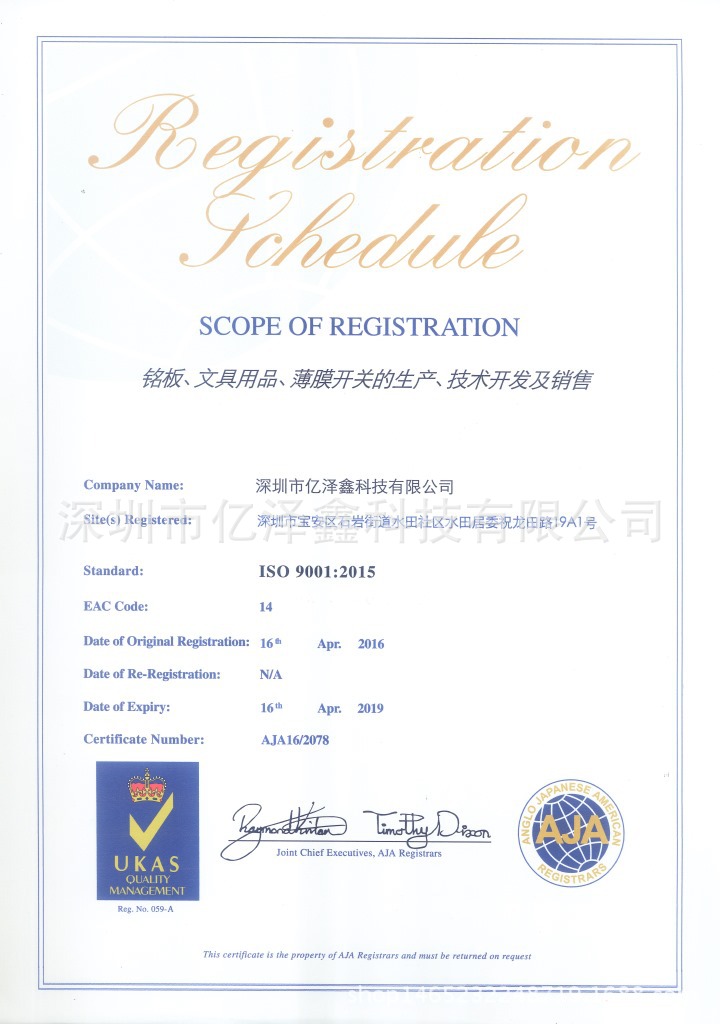 深圳市亿泽鑫科技有限公司是一家专业生产薄膜开关、铭板、镜片(亚克力、PC)不干胶、铭板、水晶滴胶,小礼品等系列产品的厂家,成立于2006年6月,工厂位于深圳市宝安区石岩镇水田水田社区石龙大道80号A栋4-6楼,厂房面积约6000平方米,员工约300余人,拥有大型无尘车间、全自动丝印机、自动丝印机、CNC精雕机、数控切割机、注塑成型机、冲床等现代化的生产设备以且先进的检测装置。工厂培养了一大批训练有素的生产人员及专业设计开发人员。公司已顺利通过ISO9001质量管理体系认证。公司经过多年的发展创新积累,产品质量已被越来越多的大型企业认可,并得到行业界的认同和赞誉。我公司长期与全国各地上千家中外企业保持着良好的合作关系,并先后被多家知名厂商评为优质产品供应商。