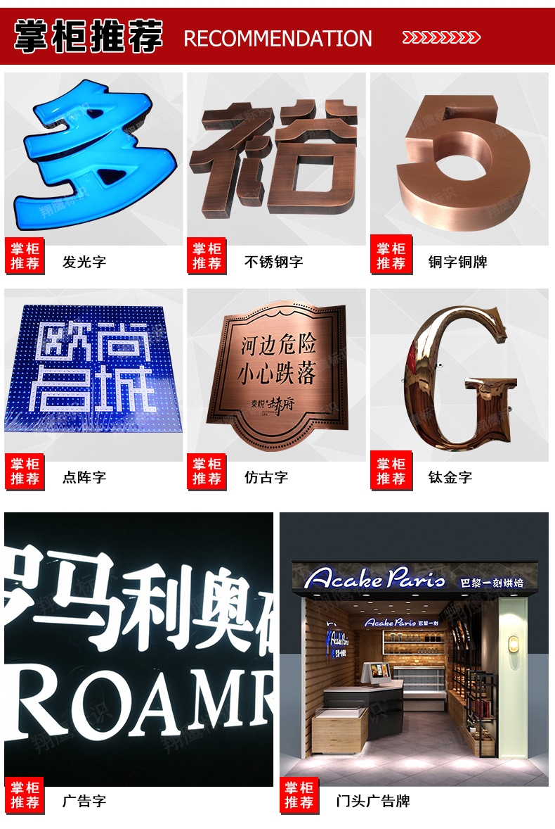 吴江翔鹰字牌坐落于全国大规模的铜字,标牌加工制作故乡-吴江北厍镇工业园内,从业人员及相关人员达5000多以上。 我厂始终致力于字牌的研究和开发,不断的改进和创新企业产品,在江、浙、沪、皖、京等都有一定盛誉,拥有精良的机械设备和多年经验的技师队伍,并具有多年的标牌制作经验和加工能力,我们汇聚了国内铜字标识行业的精英,更将传统工艺与现代化学科技结合,本厂产品精细制作,做工考究表面圆润光滑,焊接缝不显痕迹,质量可靠。远销全国各大城市及香港,台湾等周边地区,深得客户好评;本厂在苏州,上海有大型的展示厅。 商道即人道,我们始终以“诚信、务实、创新、”为服务宗旨。 翔鹰产品:不锈钢字牌、铜字牌、钛金字牌、镀锌字牌、发光字、水晶字、铝字牌、各类导向牌、徽标、龙凤工艺、仿古字、金箔字、胸牌异型卡等。