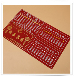 制作工艺:pvc丝网印刷、拉丝印刷、 UV彩刷、亚克力激光雕刻、铝板冲压凹凸、不锈钢腐蚀凹凸、双色板雕刻等。