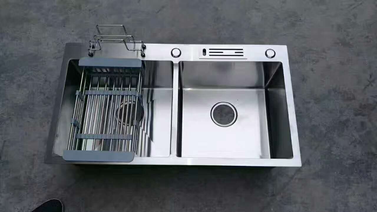 定制各种尺寸手工槽石英石水槽金色,纳米黑拉丝金带洗洁精瓶配件