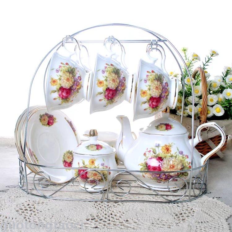 - 2018新款15头朵花咖啡具茶具套装带铁架咖啡杯陶瓷壶