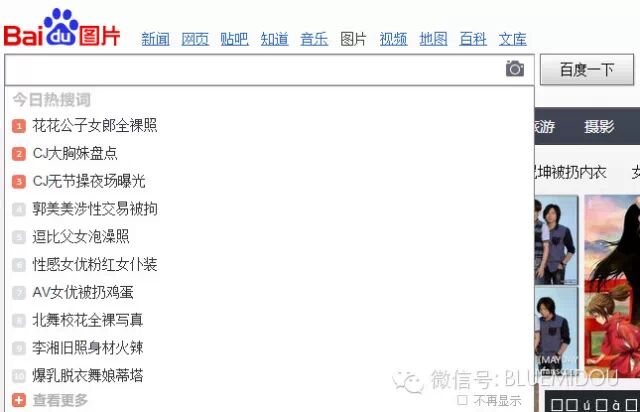 进入百度搜索也,搜素框出现【今日热搜词】,如下图所示:花花公子女郎全裸照,CJ大胸妹盘点,CJ无节操夜场曝光,北舞校花全裸写真……
