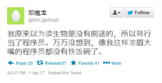 程序员立马嗅到了危机。我原来以为读生物是没有前途的,所以转行当了程序员,硅谷著名生物转行标兵邓泡戈先生在推特上说:万万没想到,像我这样浓眉大嘴的程序员都没有铁饭碗了。