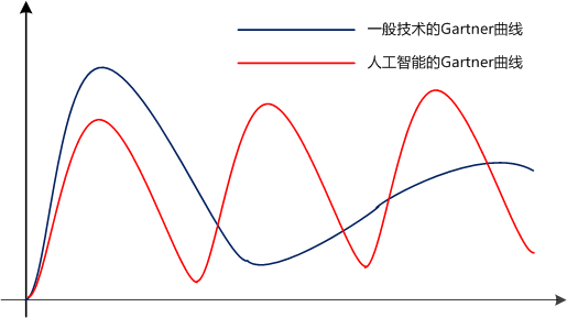 据传说,一门新技术的产生与成熟,会经历下面一条叫做Gartner曲线的过山车式发展轨迹,如下图所示。不过,人工智能的发展轨迹,却比这个要销魂地多,到目前可以说是三起三落,当然,这个第三落还没有到来,也未必一定会到来。