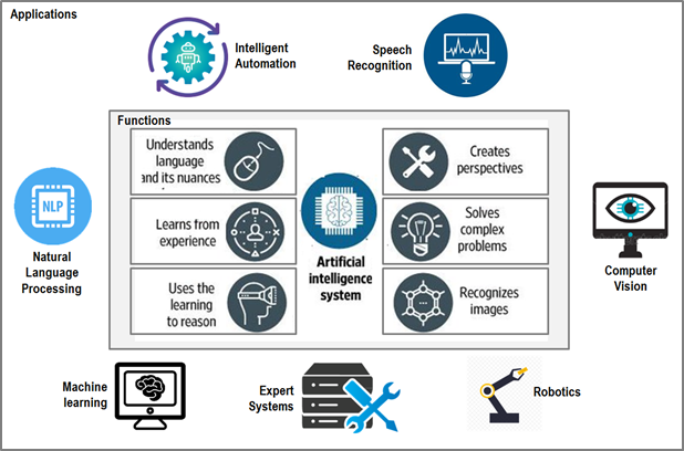 下图显示了位于中心的人工智能系统的核心功能和特性,以及支持实现这些功能的相关子领域。