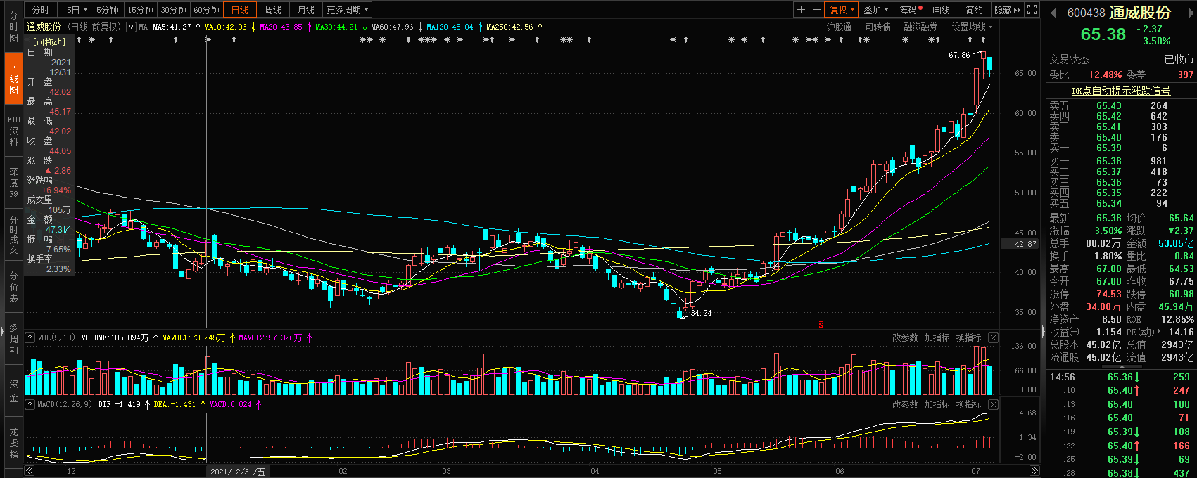 通威股份表示业绩增长的原因就是高纯晶硅业务受益于下游需求的增长,叠加新产能的顺利释放,实现量利大幅增长;电池片业务满产满销,出货量同比增长,大尺寸产品占比提升,盈利能力同比显著修复;农牧和食品板块持续贯彻质量方针,实现量利双增。
