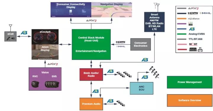 独立的音频功放接驳多通道扬声器,在车内营造各种音效环境, 提供高保真的音频享受。系统的典型功能包括强大的音效处理、 车厢内主动降噪以及引擎声效模拟。