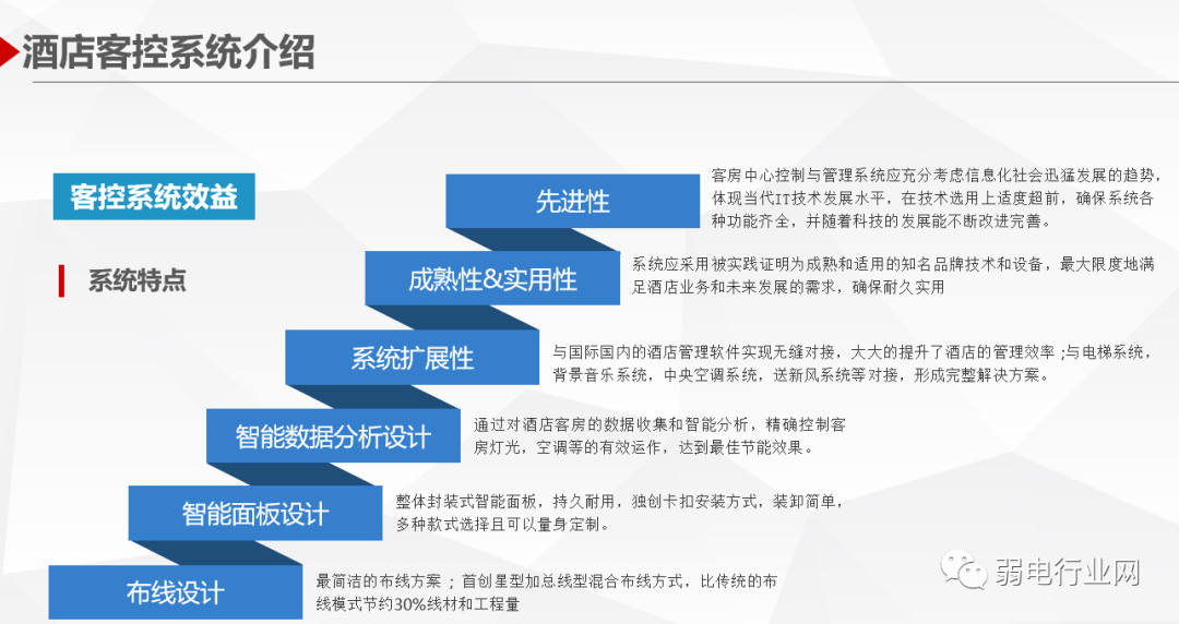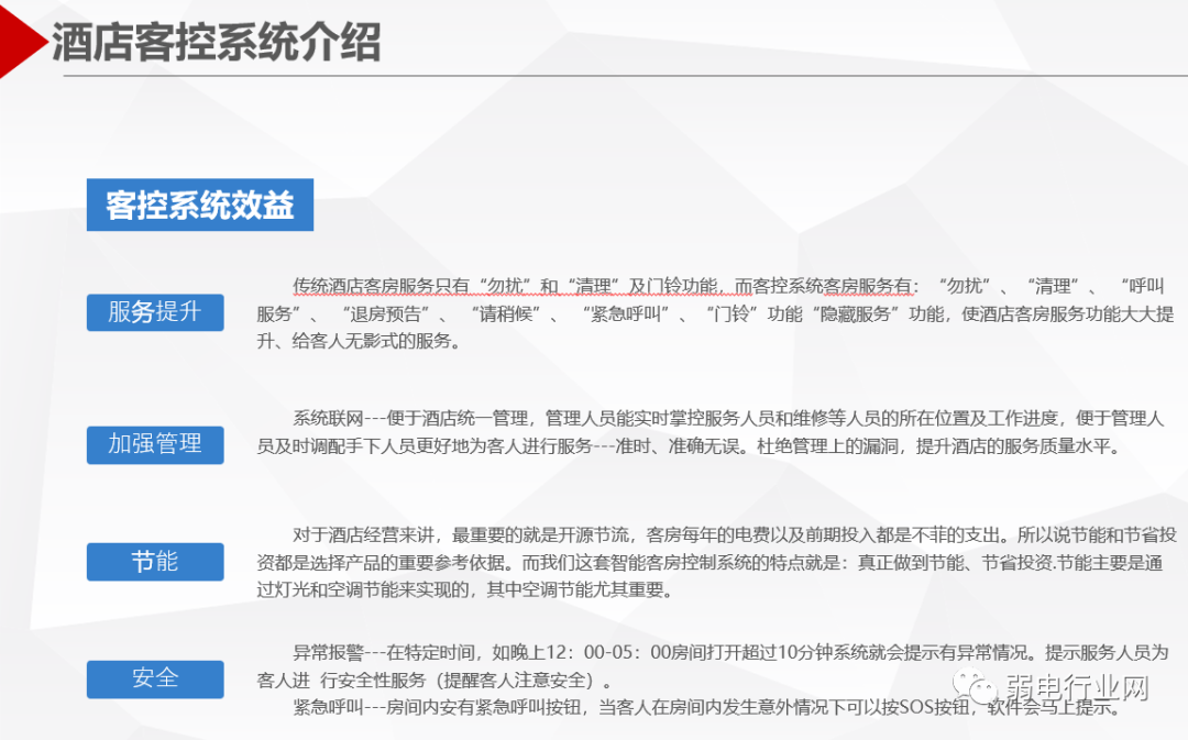 酒店客房智能控制系统集智能灯光控制、空调控制、服务控制与管理功能于一体,具有智能化、网络化、规范化、模块化、易扩展等特点,融入了科学的管理思想与先进的管理手段,帮助酒店各级管理人员和服务人员对酒店运行过程中产生的大量动态的、复杂的数据和信息进行及时准确的分析处理,使酒店管理由经验管理走向科学管理。