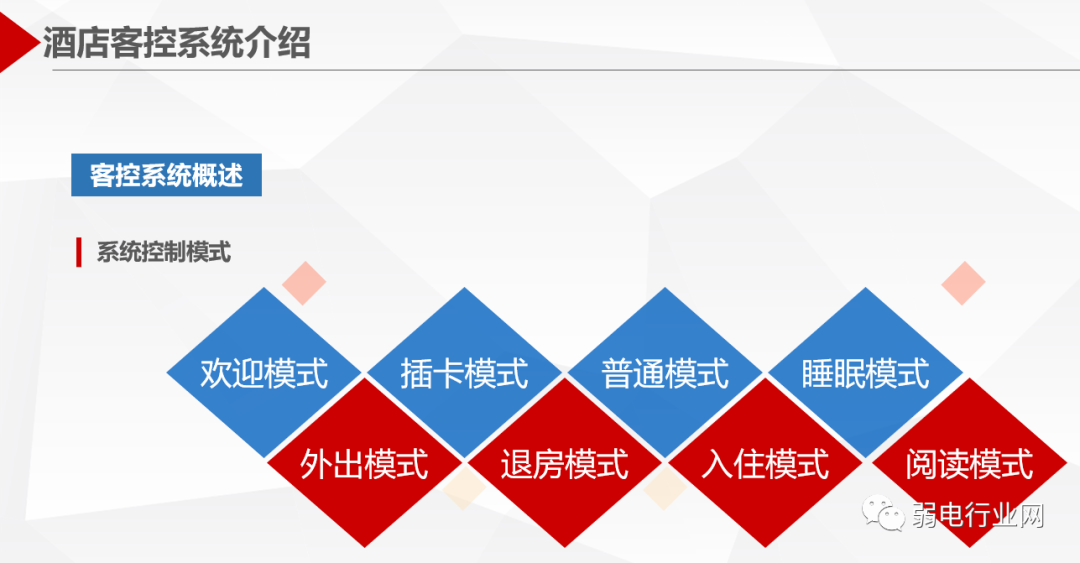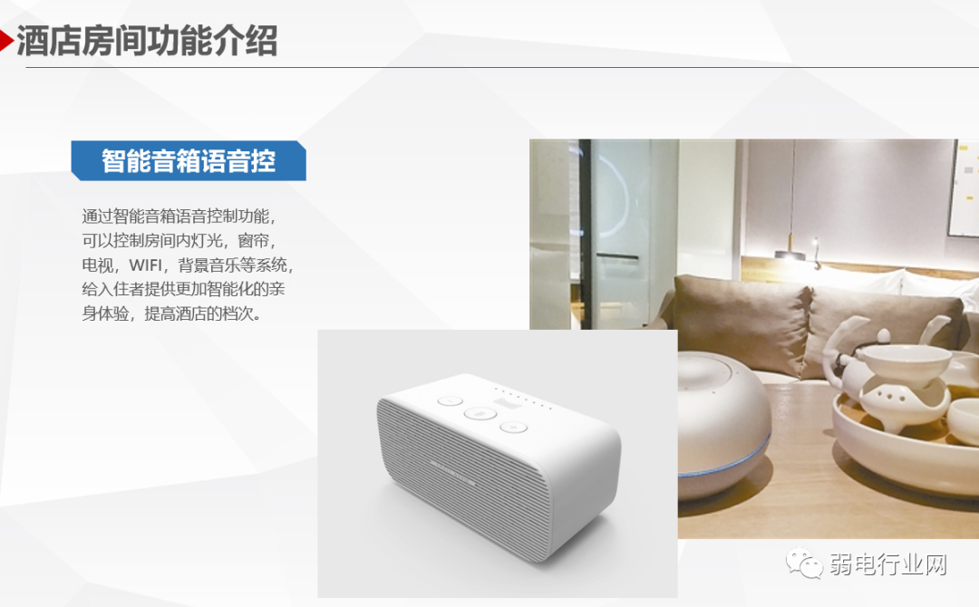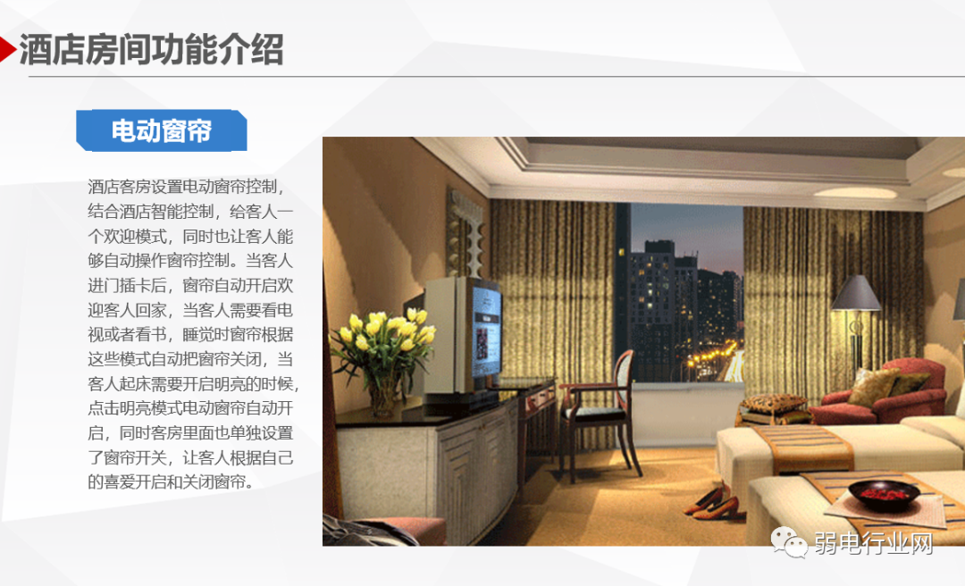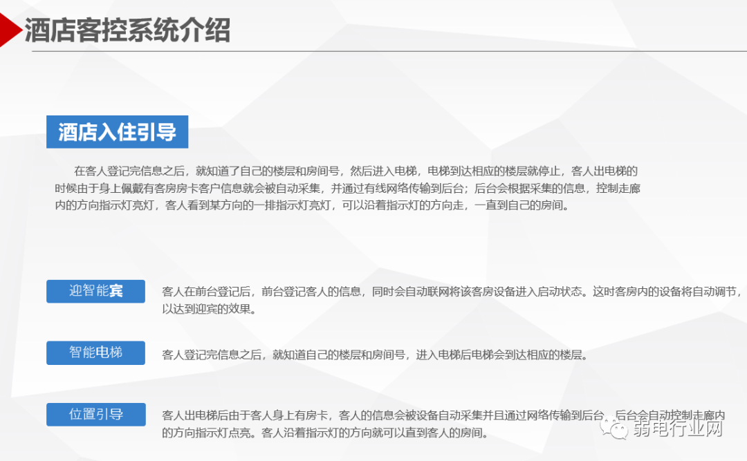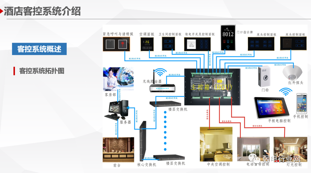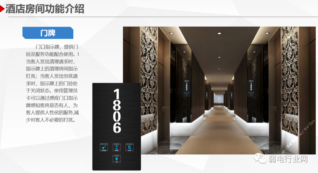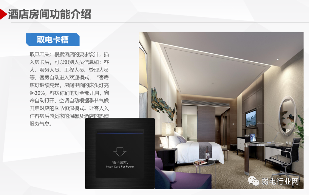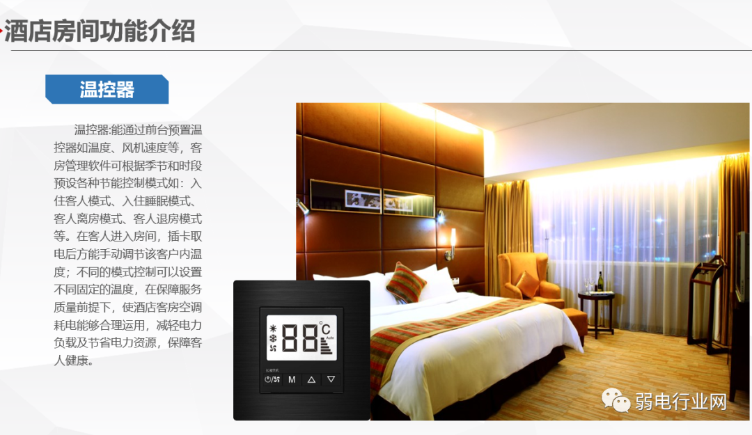 酒店客房智能控制系统针对高星级酒店的客房控制与管理需求设计、开发和制造的新一代酒店客房智能管理系统,系统利用计算机控制、通讯、网络等技术,基于客房内的智能控制器构成专用的网络,对酒店客房的安防系统、门禁系统、中央空调系统、智能灯光系统、服务系统等进行智能化管理与控制,实时监测客房状态、宾客需求、服务状况以及设备情况等,协助酒店对客房设备及内部资源进行实时控制分析。