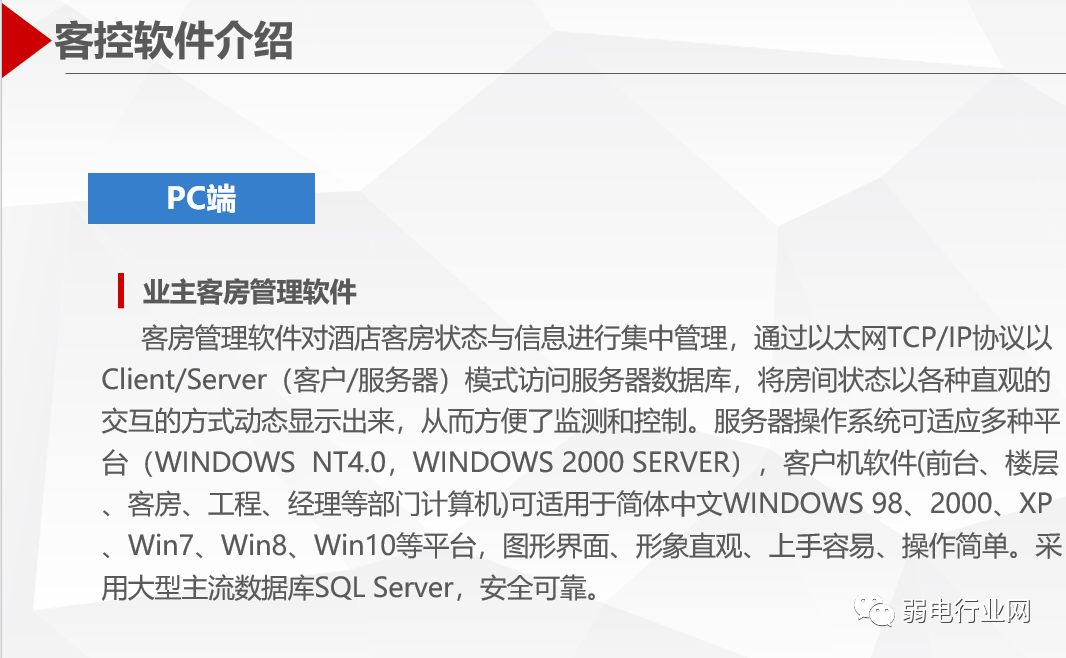 系统包括通信管理软件、客房网络控制组件/设备、网络通信设备三个部分,采用成熟的以太网TCP/IP通信协议或CAN总线协议,所有客房控制信息以C/S(客户/服务器)模式运行,保证了整个系统运行的稳定性和可靠性。