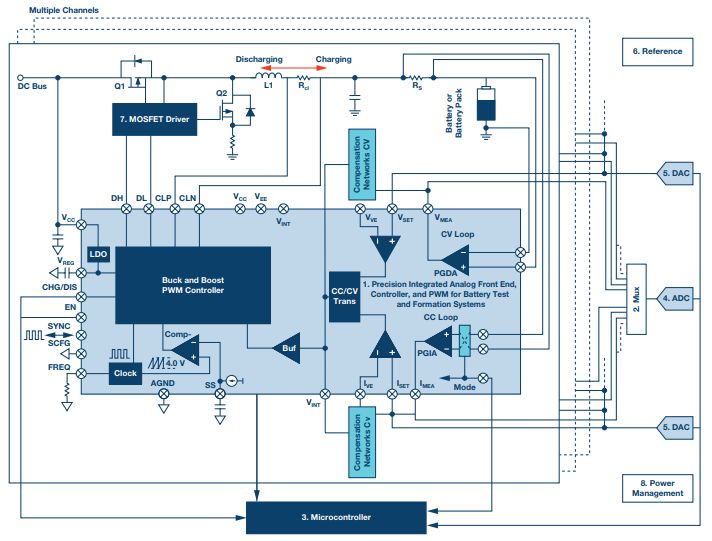锂离子电池测试设备解决方案(为了在锂离子电池制造过程中执行电气测试,需要高度集成、高效率和高精度的测试设备,这也正是ADI这款解决方案的亮点所在。与第一代IC AD8450/AD8451+ADP1972/ADP1974相比,第二代集成IC的尺寸更小,更鲁棒且性价比更高。)