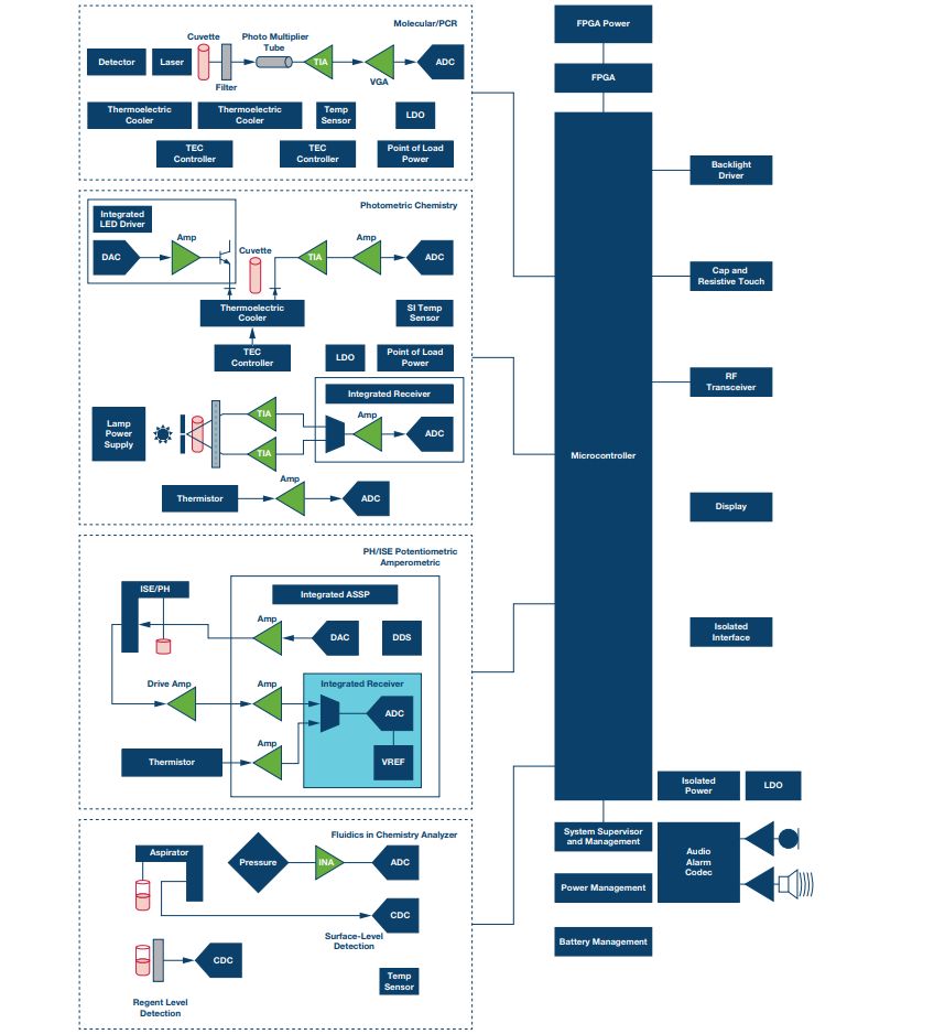 ADI公司体外化学分析仪解决方案(本解决方案提供体外化学分析仪相关的系列产品,如光学器件、模拟前端、用于I/V转换、滤波器设计、信号调理和ADC驱动的多种放大器,并提供数据转换、信号处理、传感器、接口和电源管理解决方案,使生化分析仪应用的产品质量和可靠性达到最佳程度。)