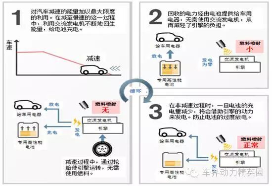 在一般内燃机汽车上,当车辆减速、制动时,车辆的运动能量通过制动系统而转变为热能,并向大气中释放,而在带启停系统即混合动力车上,这种被浪费掉的运动能量已可通过制动能量回收技术转变为电能并储存于蓄电池中,并进一步转化为驱动能量。例如,当车辆起步或加速时,需要增大驱动力时,电机驱动力成为发动机的辅助动力,使电能获得有效应用。