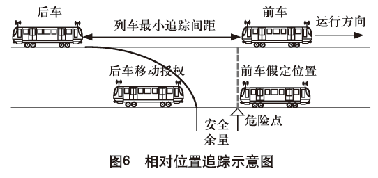 此模式下,系统以前车报告的列车位置尾端为危险点为后车计算移动授权。此种主要考虑其列车位置的处理方式,称之为相对位置方式。其追踪原理如图6所示。