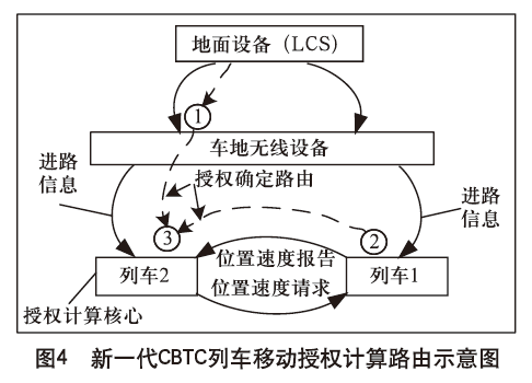 与传统CBTC系统相比,新一代CBTC系统最大的区别是增加列车与列车间的通信、由列车车载设备计算自己的移动授权。传统CBTC与新一代CBTC列车移动授权计算路由对比如图3、4所示(以列车2移动授权确定为例):