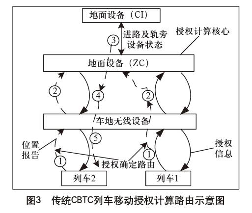 传统CBTC系统以地面设备为列车运行的控制核心,列车运行控制采用从列车-地面-列车的方式,即前车将自身定位信息发送给地面,地面根据前车的位置报告,并结合其他安全条件,为后车计算移动授权并将移动授权发送给后车。列车需要与地面进行去、回通信交互,因此增加了信息周转时间,系统也需为这些延时增加相应的处理机制。