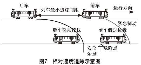 在此模式下,系统以前车报告的列车位置外加前车当前速度信息为依据,为后车计算移动授权点,称之为相对速度方式。选取的危险点为假定前车以当前速度触发紧急制动停车后列车尾端。其追踪原理如图7所示。