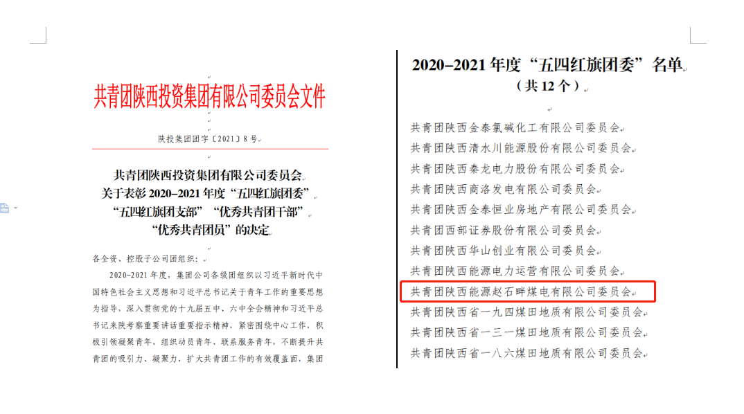 近日,集团公司团委印发《关于表彰2020-2021年度五四红旗团委五四红旗团支部优秀共青团干部优秀共青团员的决定》,公司团委荣获五四红旗团委称号,综合办公室薛孝晗、发电部燃运中心张佳杰荣获优秀共青团员称号。(牛亮)