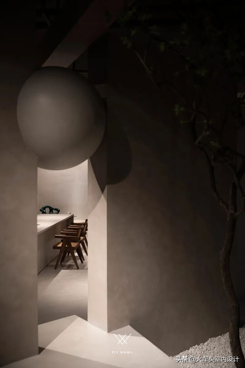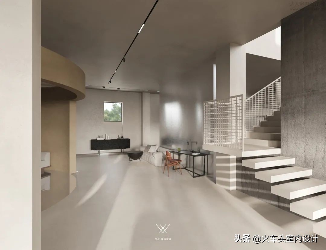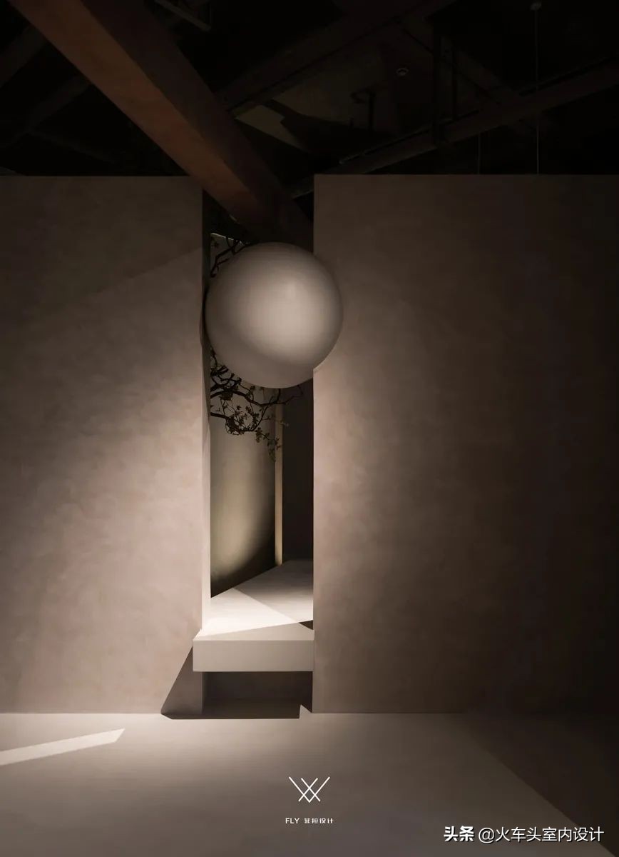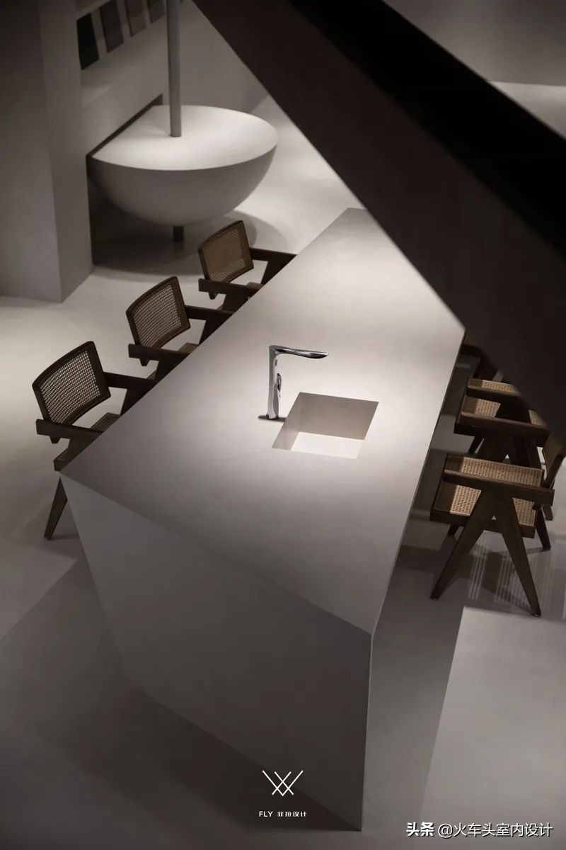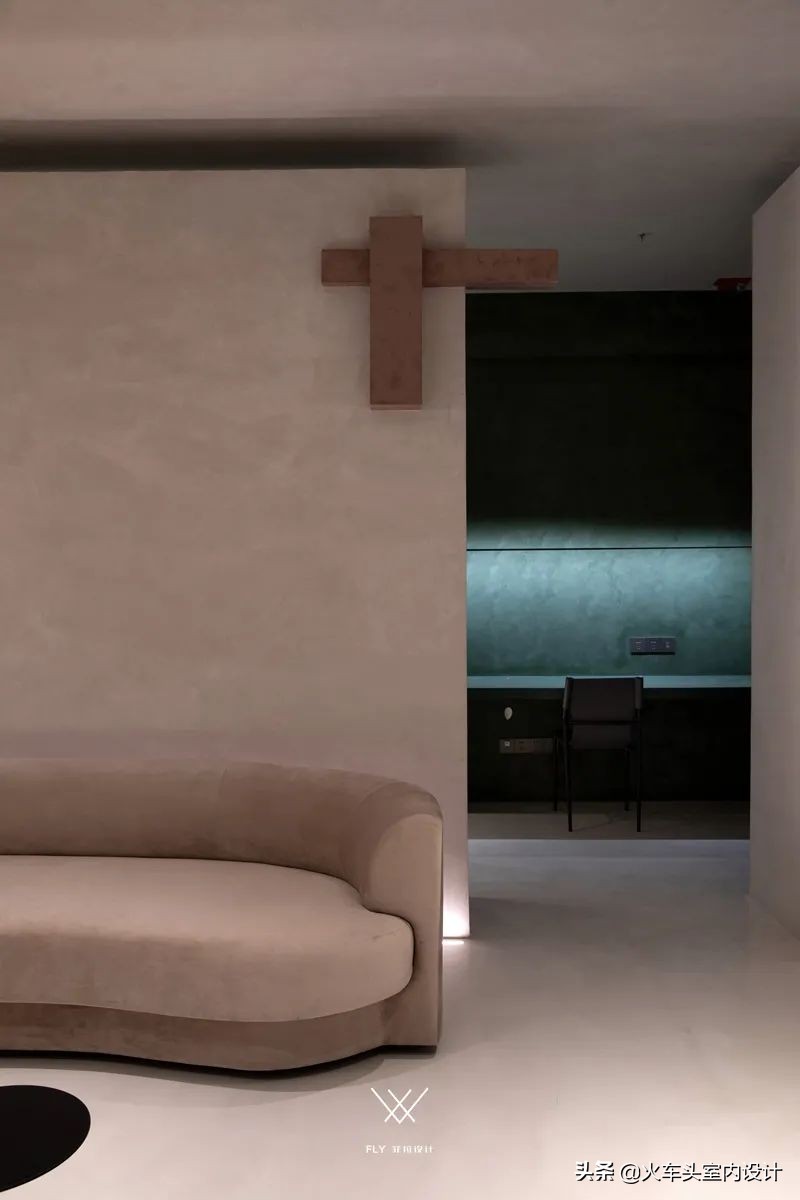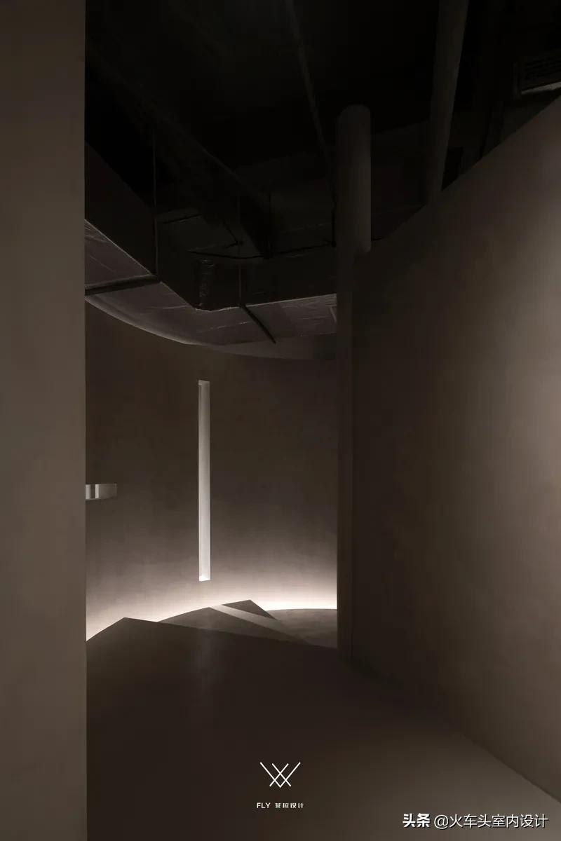 悬空不规则几何,结合微水泥带有的独特质感,打造一个自由舒张、不受束缚的空间形态。