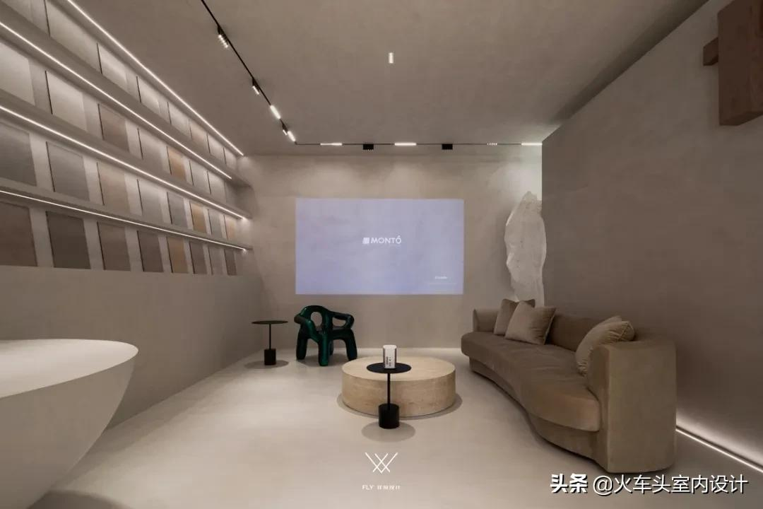 会客区一面展览,一面投影,三面各有其功能属性,利用空间本身特性,以干净、舒爽的方式把握空间占比,有条不紊地呈现空间中应有的实用性状态。
