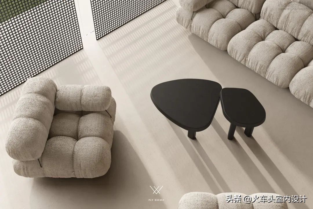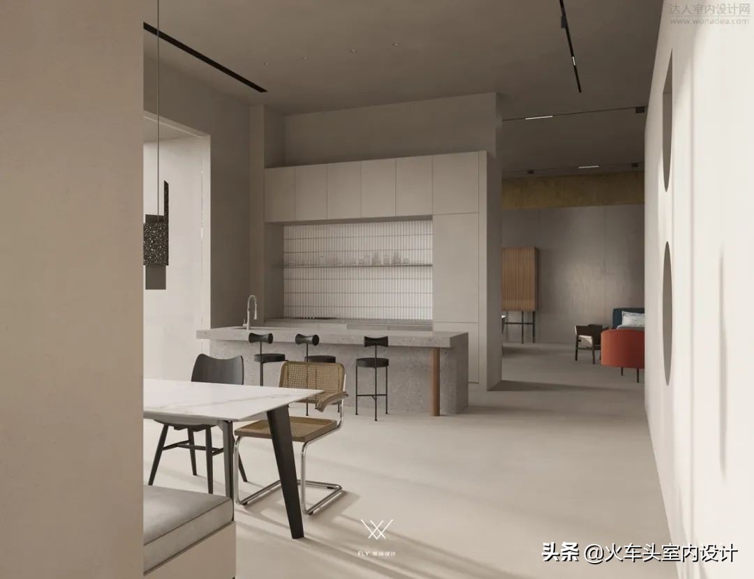 区域设计色彩与结构上有别于其他, 移步换景步步生花的游园式体验感沿途绽放。墙面多个洞口错落一改封闭逼仄,倾吐空间呼吸感;内外互动、光感调和,刚刚好的里外,拉近陈设与生活之间的家居环境,打造相似性、0距离感。