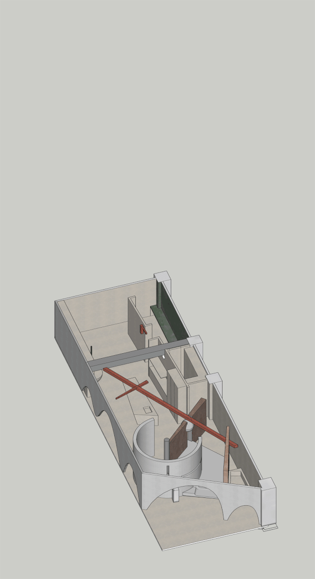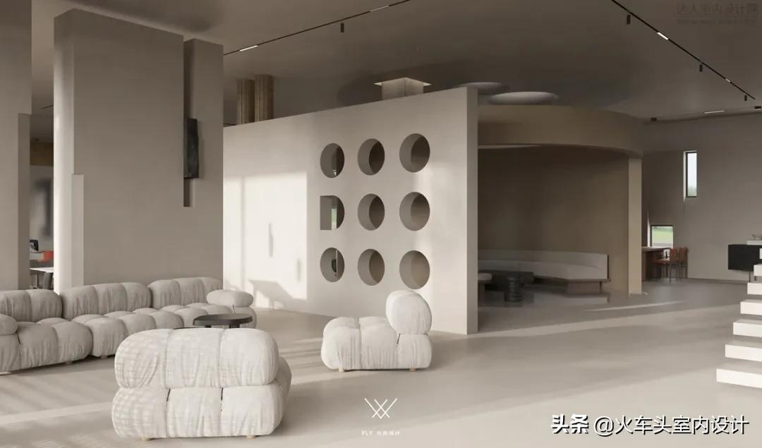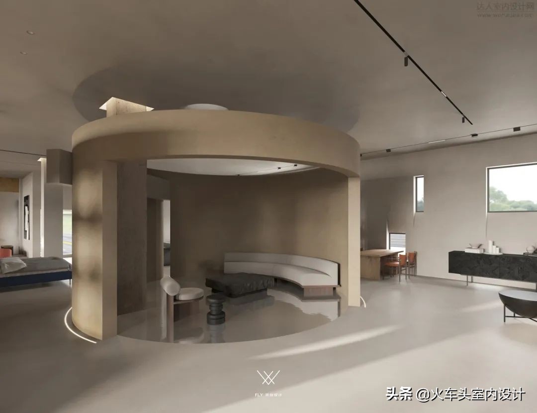视角内斜插区域上空的横柱便是D I O中的I,借而体块的穿插重组形成新的限定空间,轻盈体感分割形成区域表达的独立空间。依据视觉认知方面的格式塔理论加入的曲线、椭圆等形状,相比硬朗的线条与几何形式,更具抚慰人心的作用,曲直辗转中和有度。