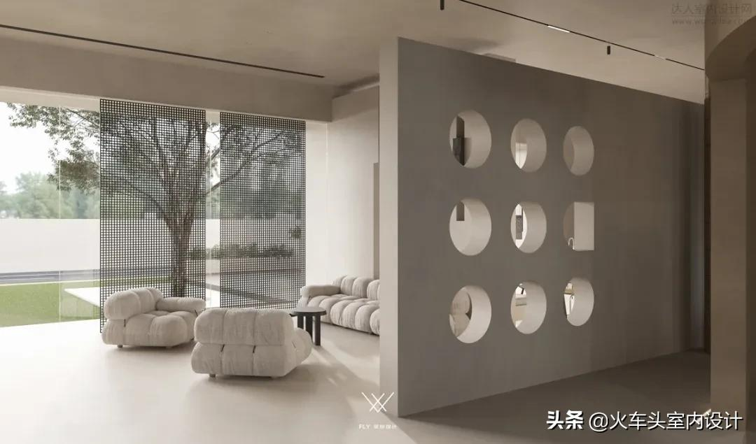 借由洞板的创意形式立于区域边界一侧,通透、趣味,模糊其功能本质,是隔断亦是装饰,利用方向位置为临街一侧作为对外展览窗口 ,进行空间升值化处理。