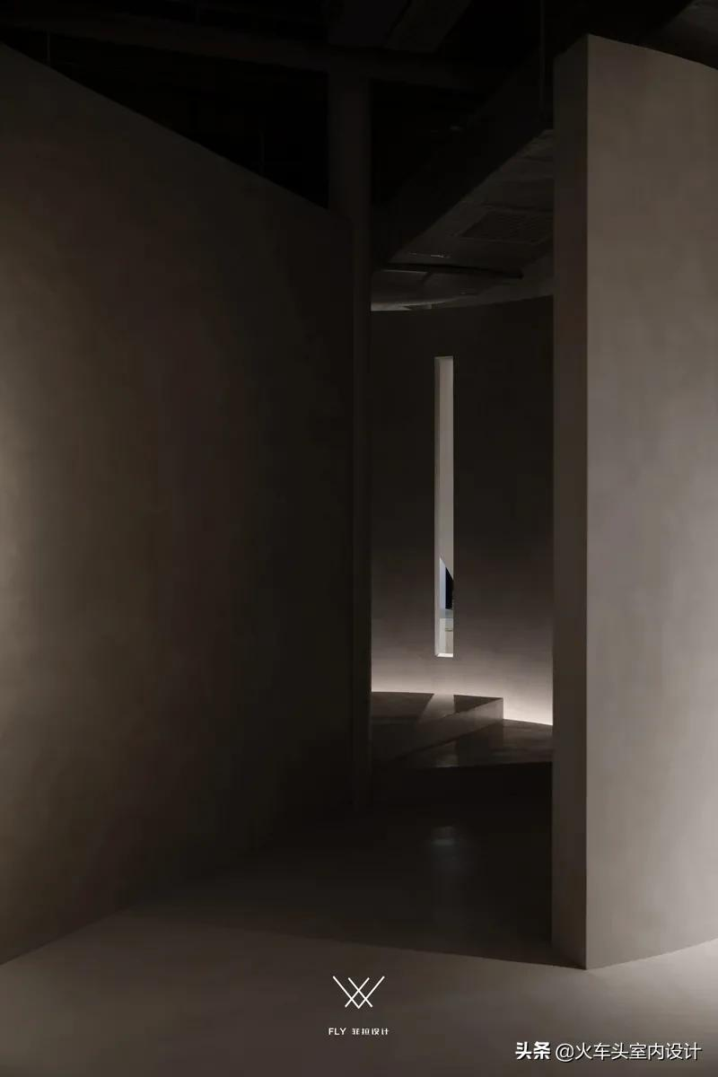 展厅入口通道以微建筑的概念展开,由小及大、由外及里,循序渐进的感官掌控形态;抛去承担通道的物理使用功能以外,悠长廊道更是扮演着一个氛围制造者的角色,通道与阻隔双重角度的作用,亦是内外空间的过渡,给予到访者恰当的情绪缓冲以及神秘感、好奇心的驱动加载时间,以更为匹配和饱满的情感状态回应所处功能空间。