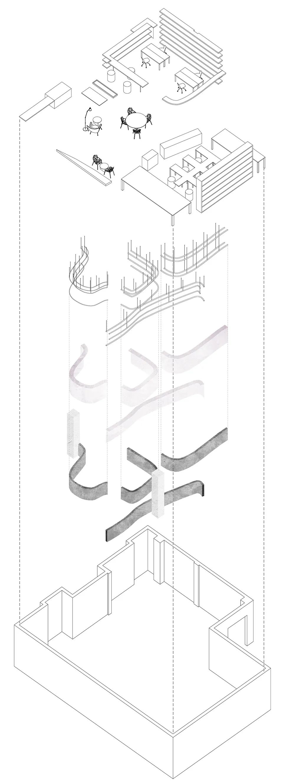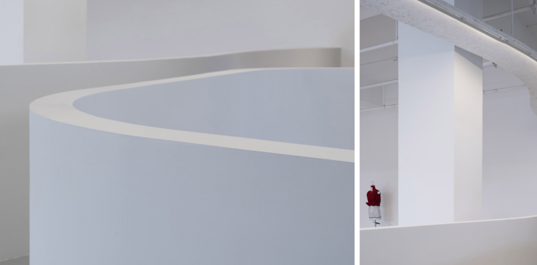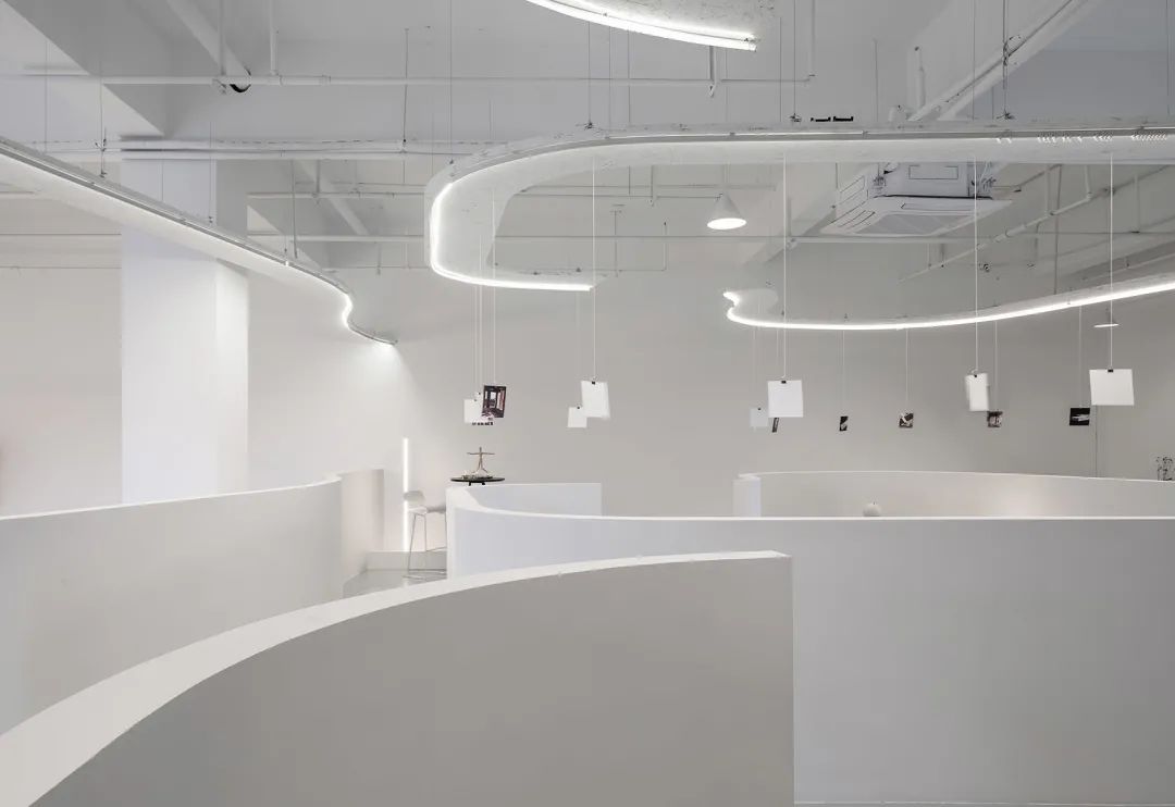 一段柔软的墙由矮墙与布帘构成,矮墙的高度被设计成工作与休憩所需的私密感受的模数;布帘则放置在视平线的高度,将更多的交流与互动罩上一层朦胧。空间时刻处于混沌与清晰的动态,置身其中仿佛行进在流体中,给工作者和观展者一次反日常的感官体验。