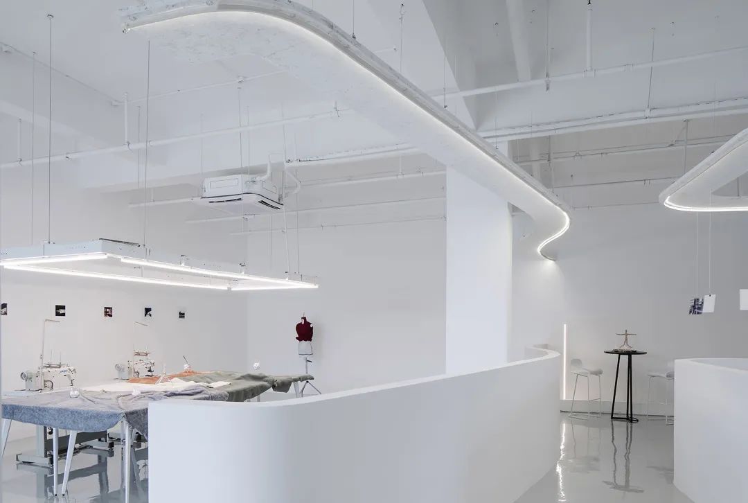 设计启发于织物的柔性与重力感。平面被非线性的柔软的墙划分成设计区,物料缝纫区和生活区。每个区域仅放置一个元素来对应功能。一段柔软的墙由矮墙与布帘构成,矮墙的高度被设计成工作与休憩所需的私密感受的模数;布帘则放置在视平线的高度,将更多的交流与互动罩上一层朦胧。