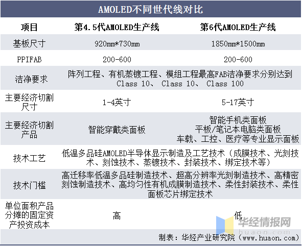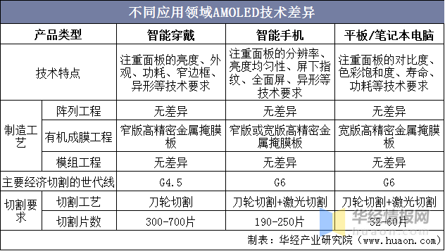 不同应用领域的AMOLED半导体显示面板在技术特点、制造工艺、世代线及切割要求等方面存在一定的差别。
