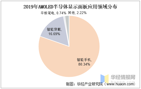 在智能手机、智能穿戴以及平板/笔记本电脑等下游应用领域,AMOLED半导体显示面板已展现出较强的竞争优势,从出货量占比来看,智能手机领域应用最广泛,占比高达80.34%,随后是智能穿戴和平板笔电,分别占比16.69%、0.74%。