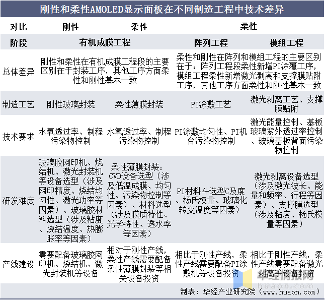 AMOLED可以分为柔性和刚性,柔性AMOLED显示面板在形态方面更具可塑性,可实现弯曲、折叠以及卷曲等产品形态,具有更多场景应用的可能性。柔性和刚性AMOLED显示面板在制造工艺、技术要求、研发难度、生产线建设等方面存在差异。