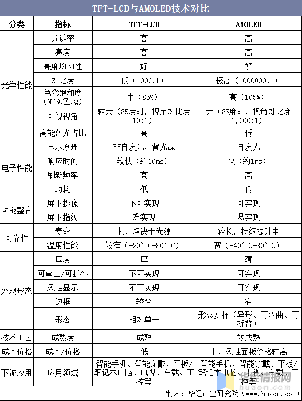 TFT-LCD技术成熟度较高,是目前半导体显示的主流技术之一。AMOLED作为半导体显示的新技术,在光学性能、电子性能、整合功能以及外观形态等方面具有较强的优势,代表了半导体显示技术新的发展方向。