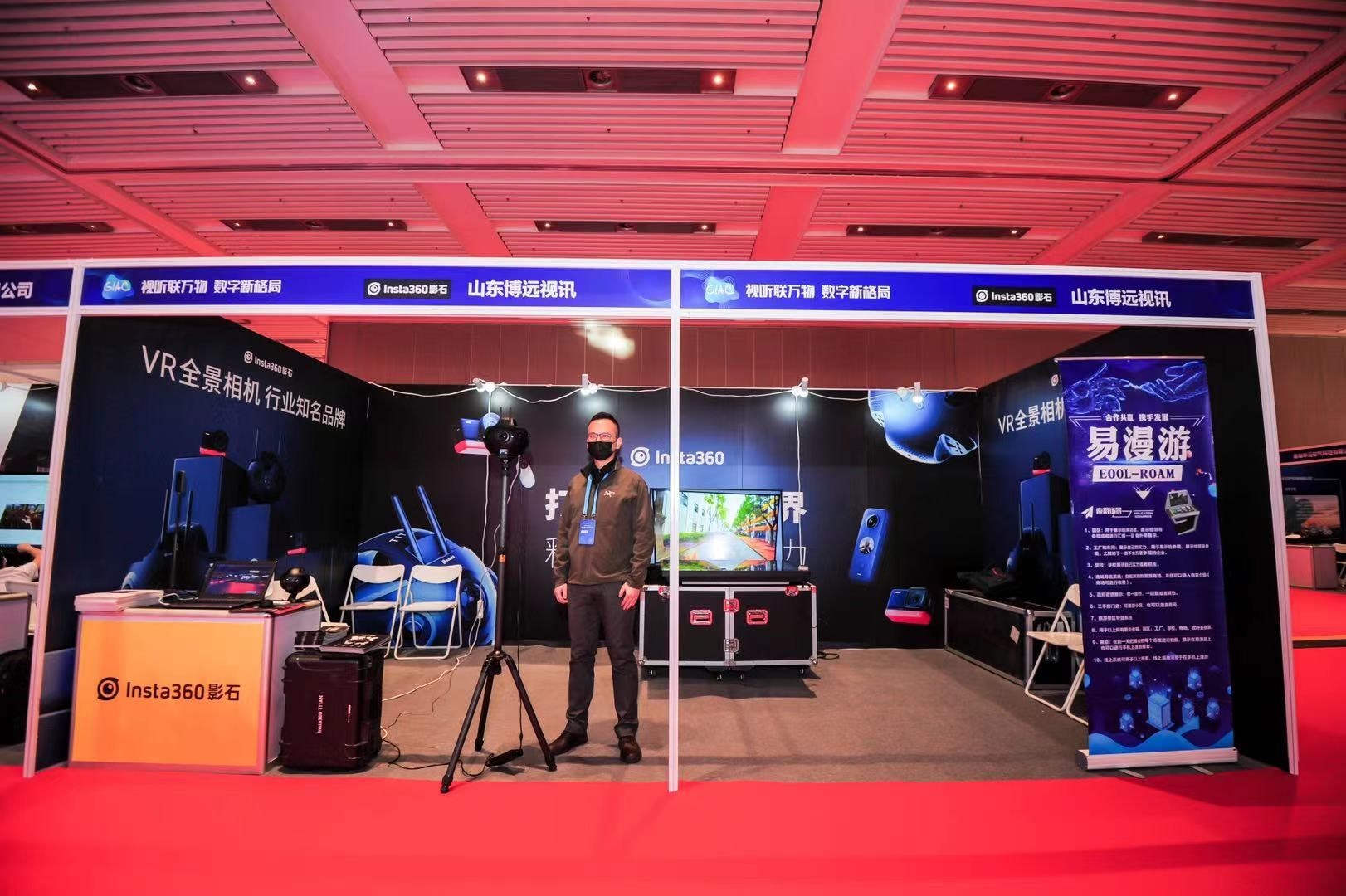 Insta360在本次展会上带来了主题为5G VR 4K全景直播,以insta360 Titan全景相机作为采集端,通过配套控制软件把8个独立鱼眼镜头画面实时拼接为1个全景画面,再通过HDMI线显示在大屏幕中,观众通过电脑端、手机App端、大屏幕端及VR眼镜端等几种方式都能实时沉浸参会。