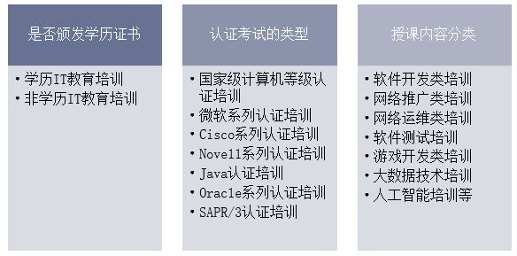其中,非学历IT教育以民办教育为主,包括以通过IT认证考试为目的的教育培训和以IT技术学习、提升工作能力为目的的教育培训。按照认证考试的类型不同,以通过IT认证考试为目的的IT教育培训可分为:国家级计算机等级认证培训、微软系列认证培训、Cisco系列认证培训、Novell系列认证培训、Java认证培训、Oracle系列认证培训、SAPR/3认证培训等;按照授课内容的不同,以IT技术学习、提升工作能力为目的的教育培训可分为:软件开发类培训、网络推广类培训、网络运维类培训、软件测试培训、游戏开发类培训及新兴起的大数据技术培训和人工智能培训等。